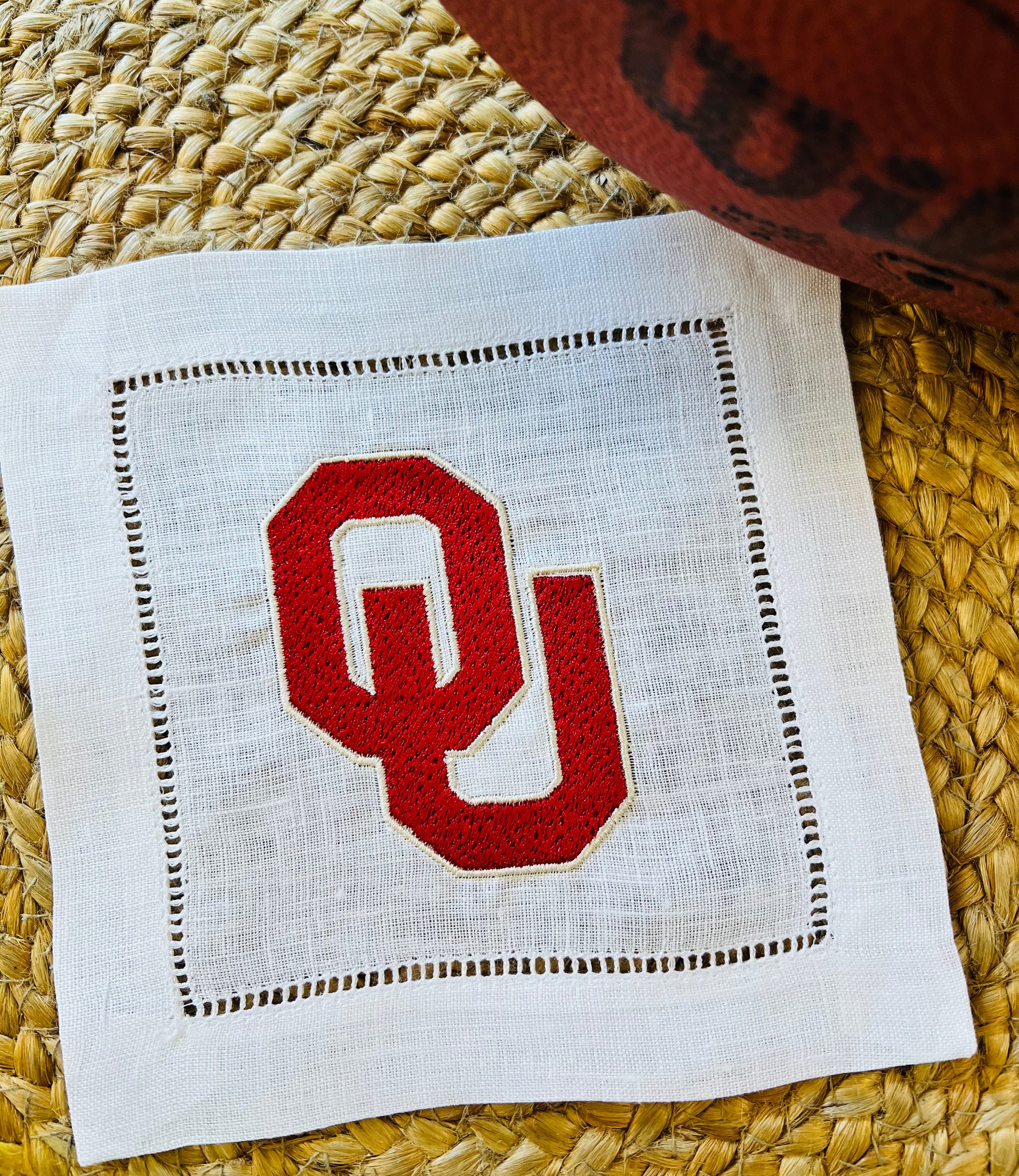 Calling all Boomer Sooners! OU set of 4 cocktail napkins embroidered on white hemstitched white linen. Go Sooners!!!!