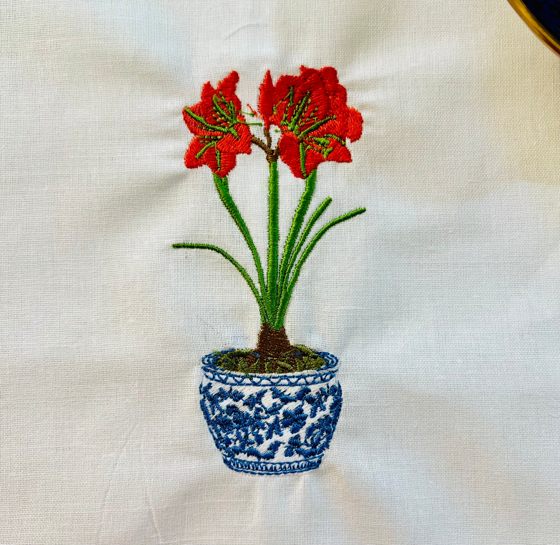 Our Chinoiserie Amaryllis tea towel is embroidered on a hemstitch 14" x 22" linen cotton blend white tea towel.