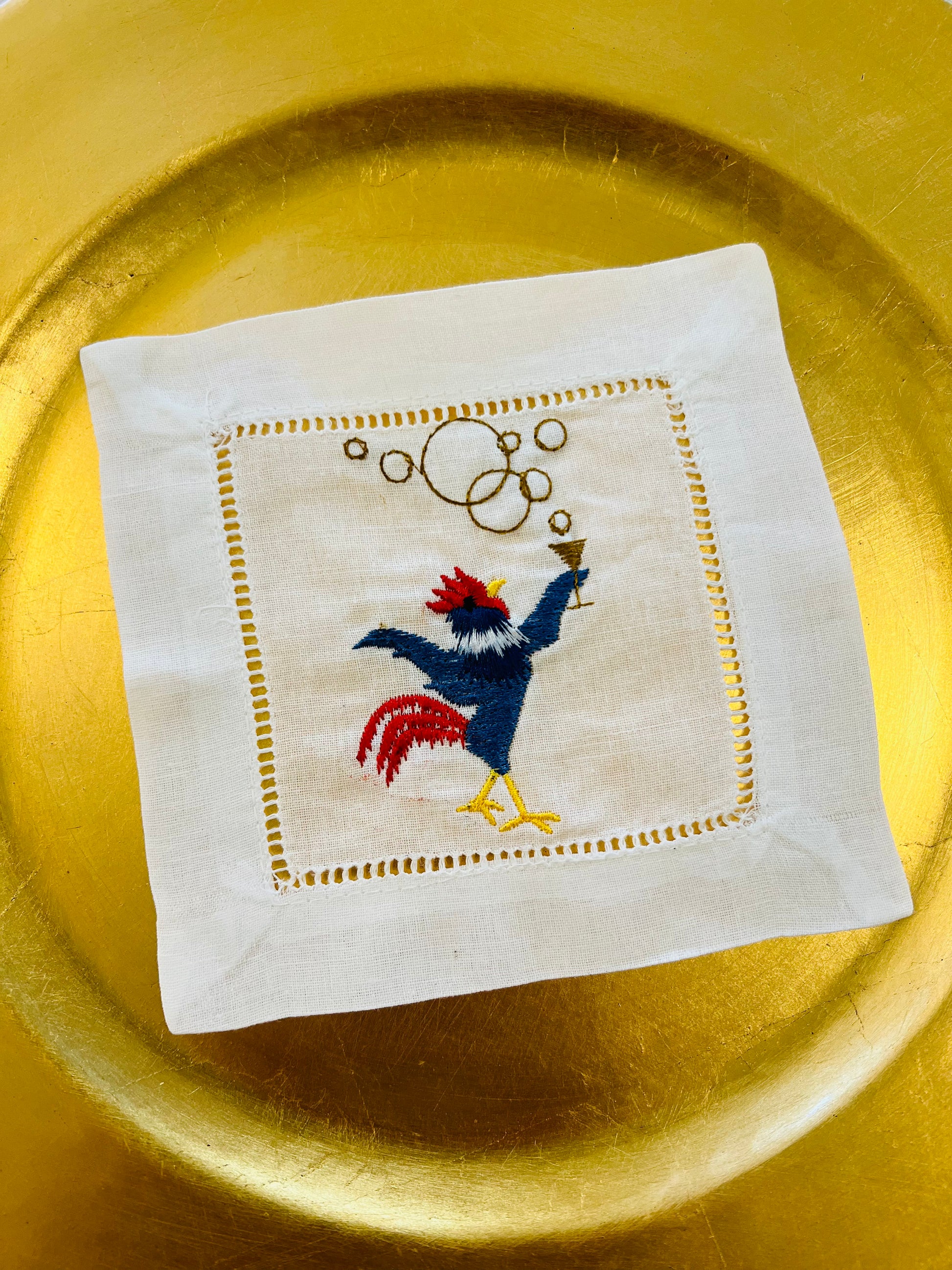 Cock-A-Doodle-Doo.......our fun "Cocktail" napkin is embroidered on a hemstitch 6" linen cotton blend white square napkin.