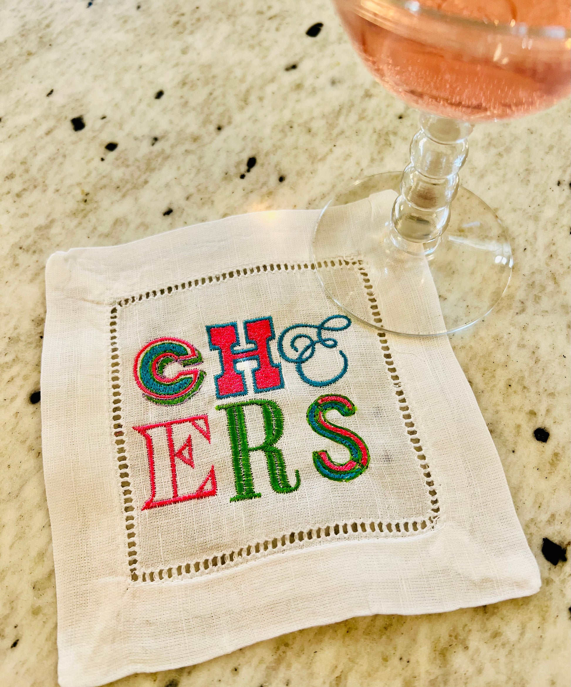 Our Cheers cocktail napkin is embroidered on a hemstitch 6" linen cotton blend white square napkin.