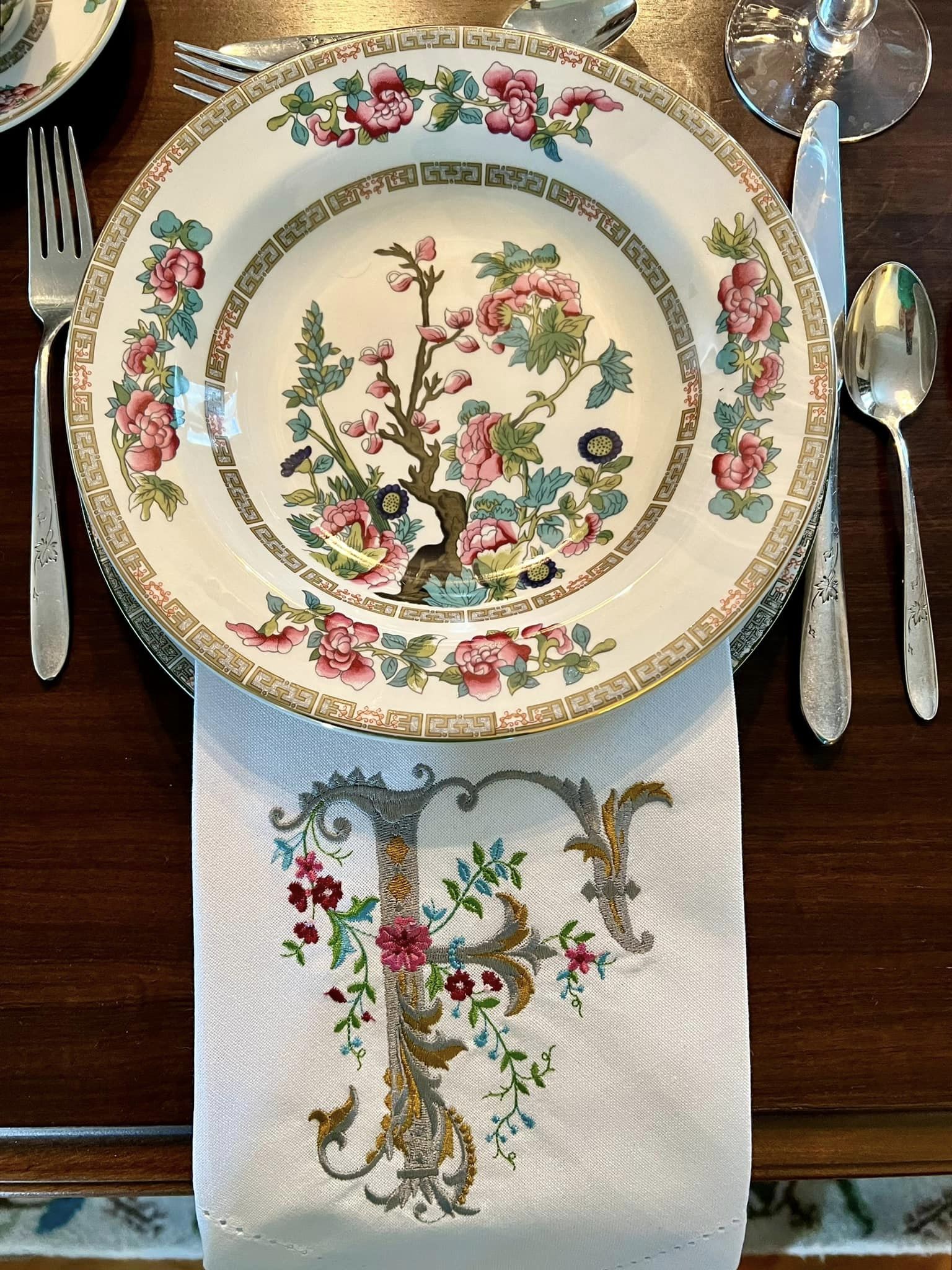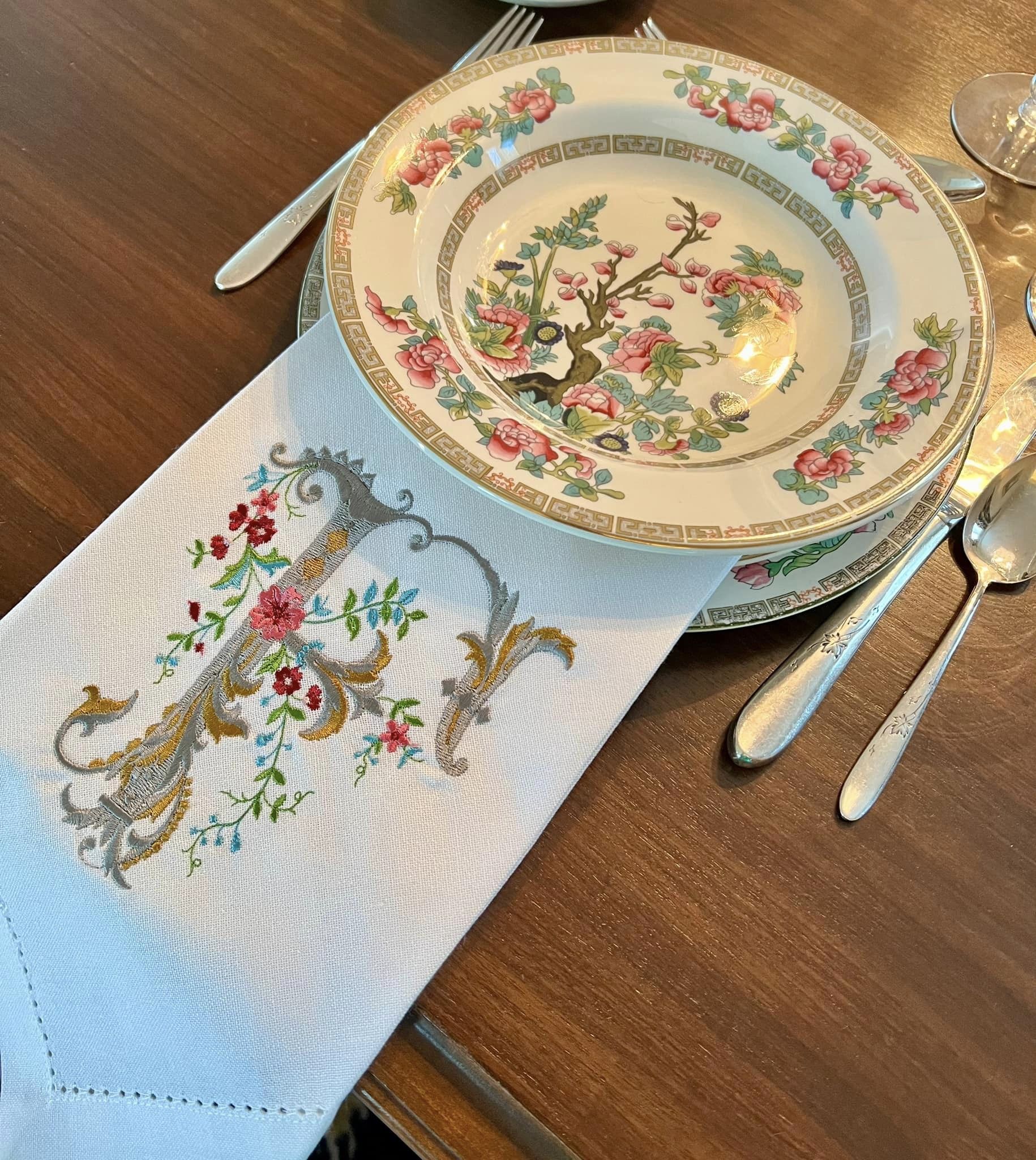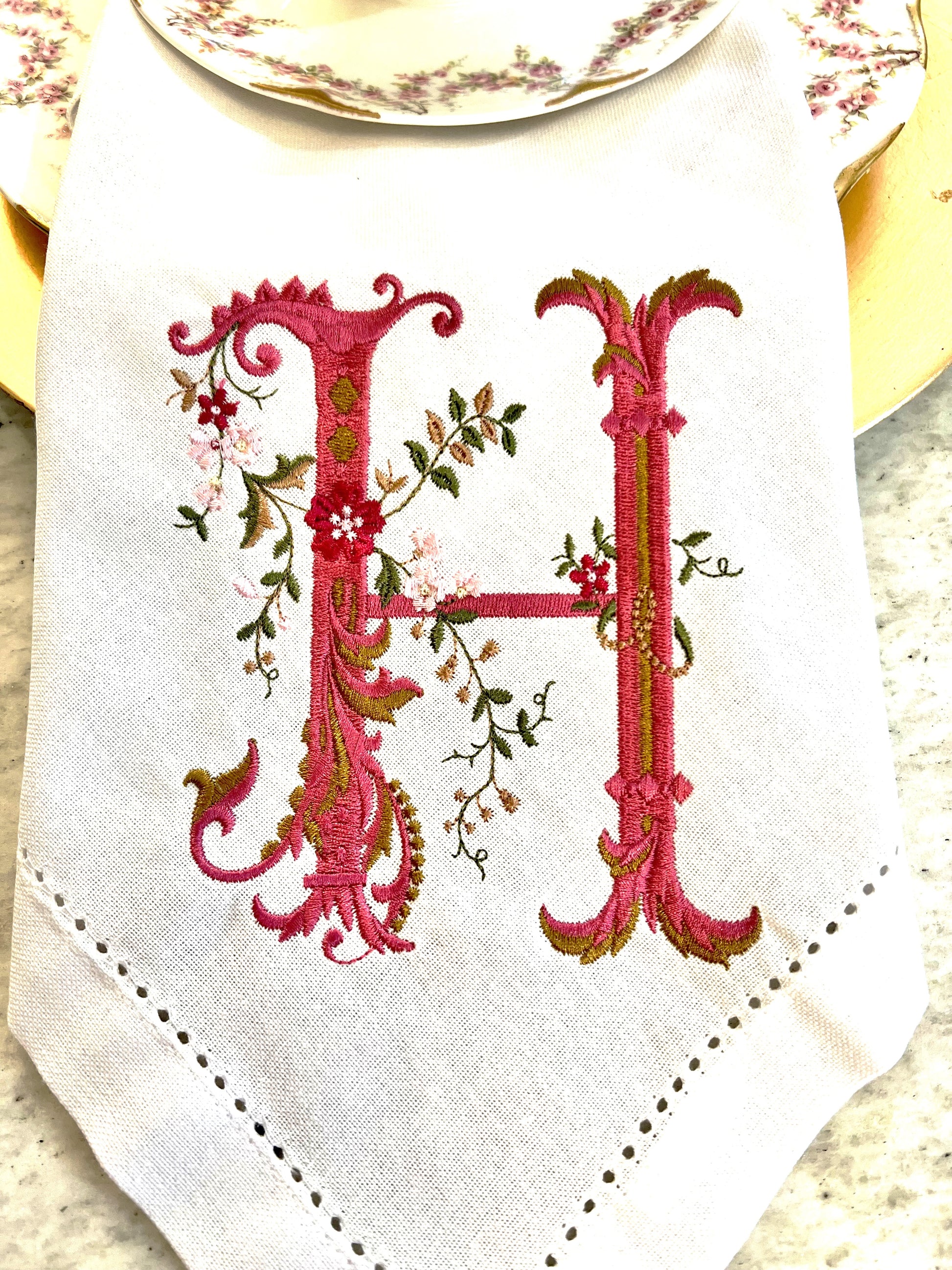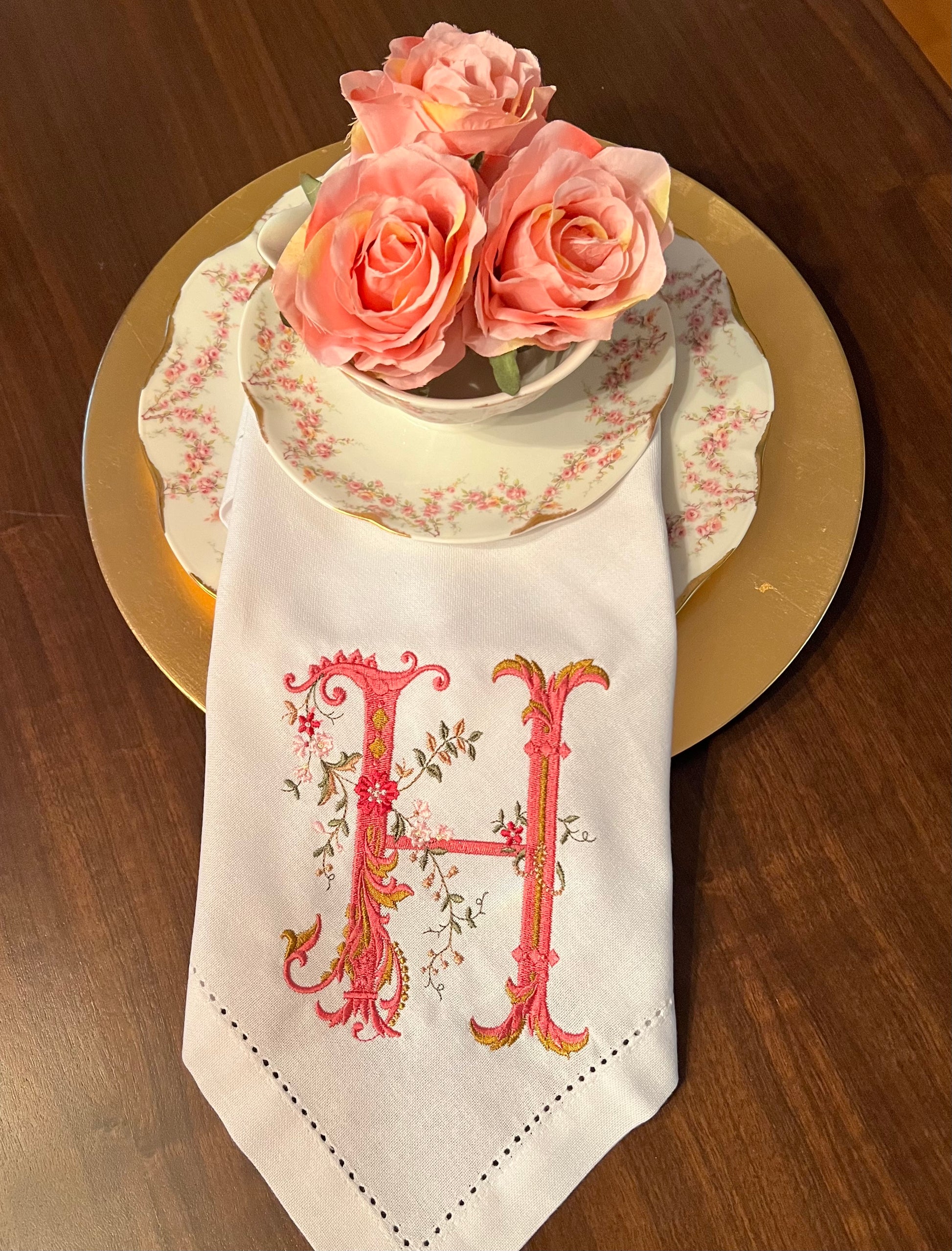 Beautiful Diamond Font monogram embroidered napkin on 100% linen hemstitch 18" x 18" white dinner napkin. This is a fabulous font to match your best china. It consists of seven colors of your choice. This is a very popular monogram!