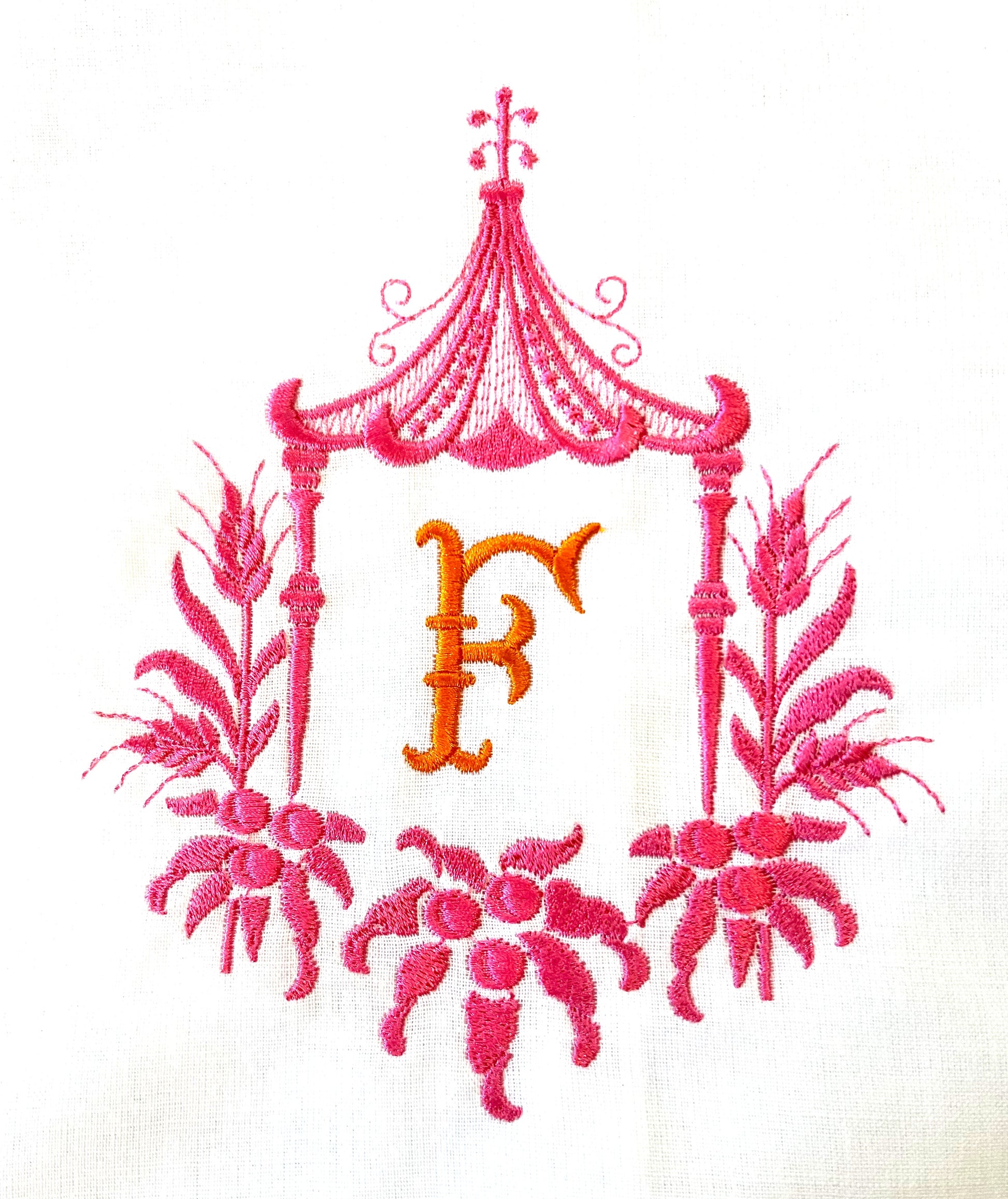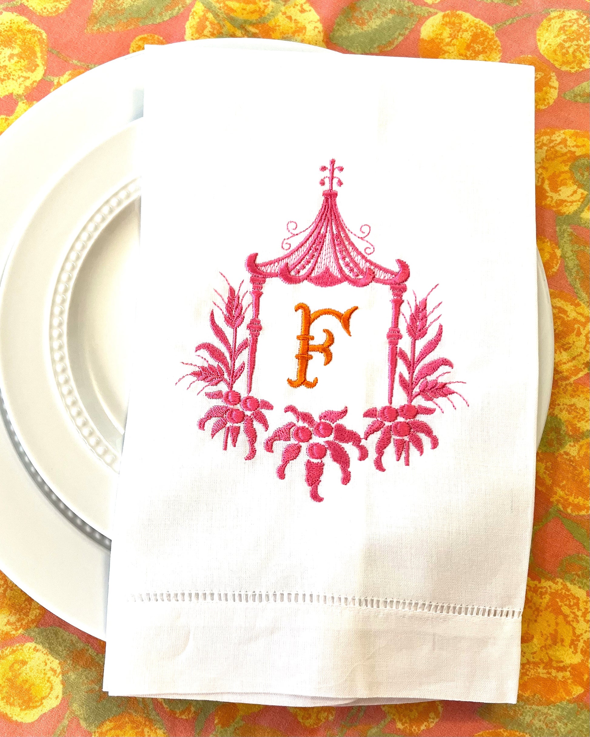 Chinoiserie Pagoda with Monogram Embroidered Tea Towel