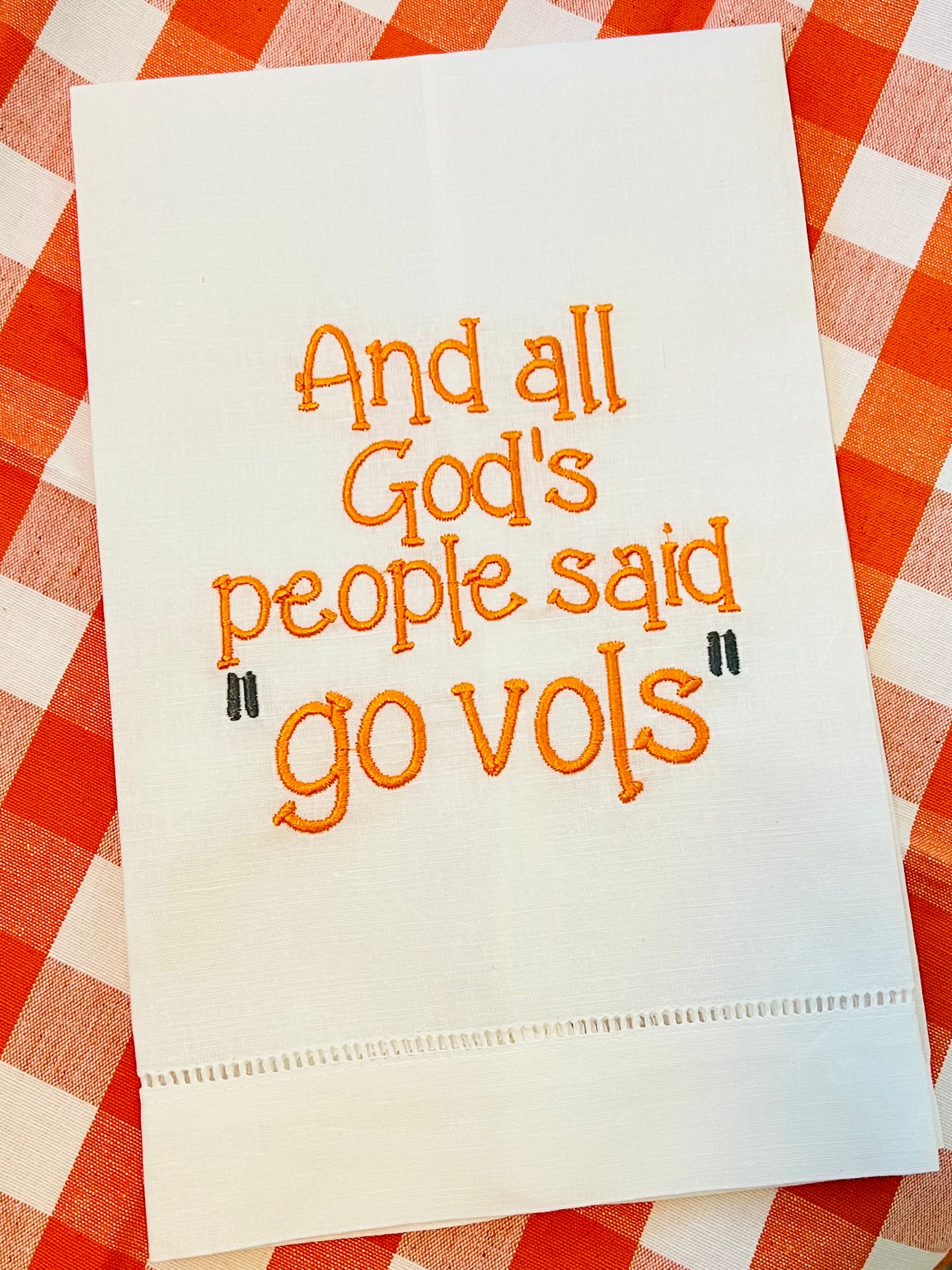 “Rocky top, you’ll always be…” tea towel monogrammed with “And all Gods People said Go VOLS” on white tea towel. Orange and Gray embroidery shown but could be done in any color.