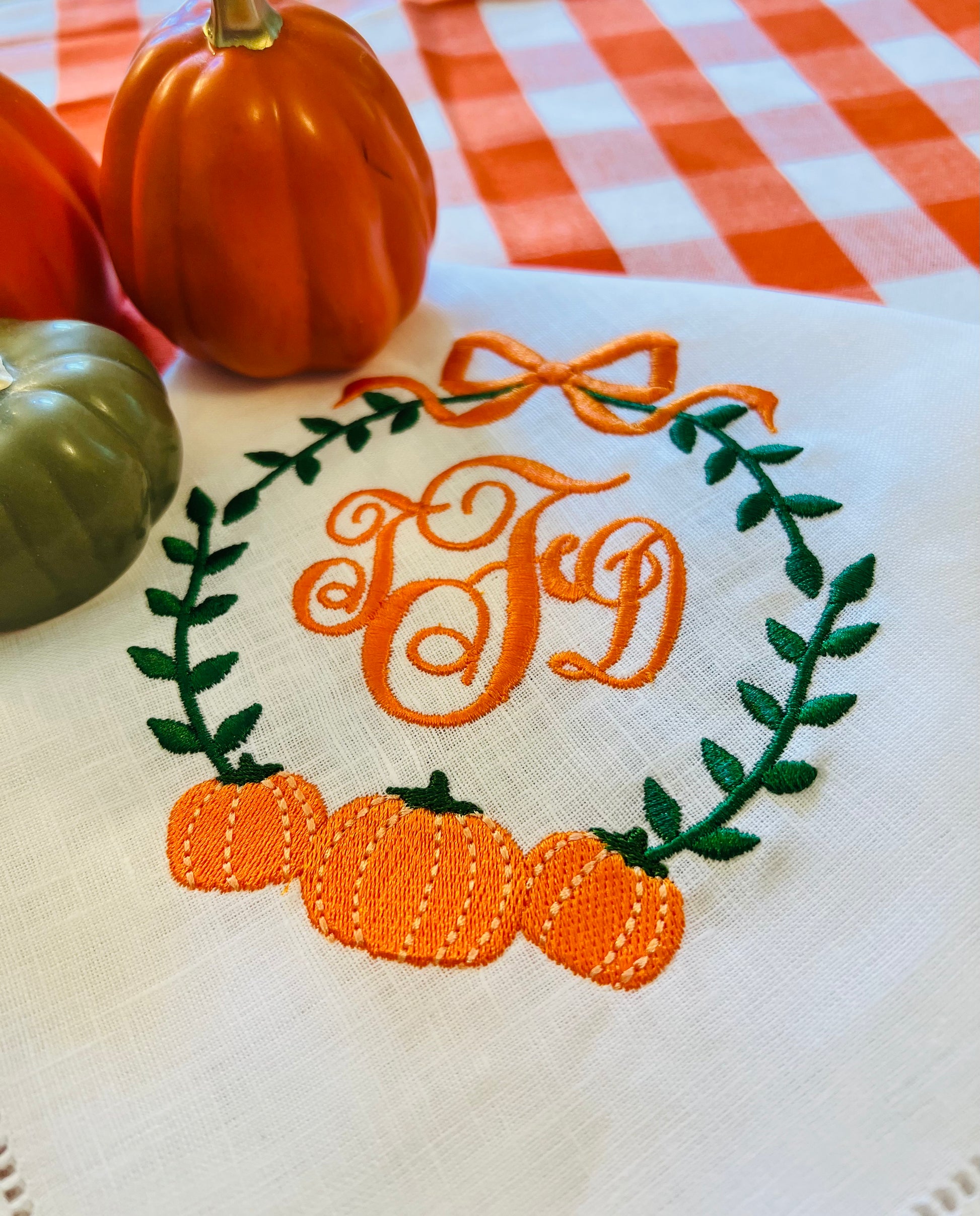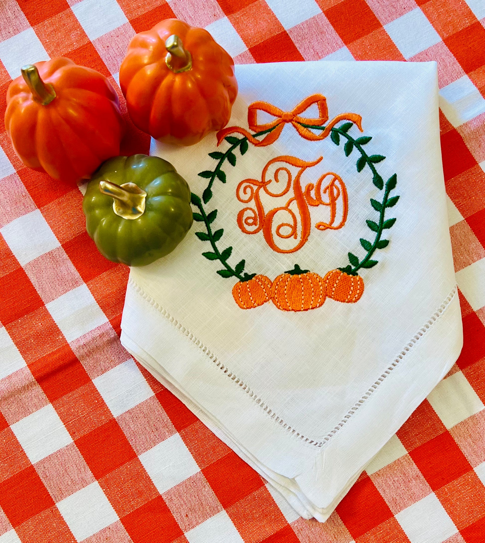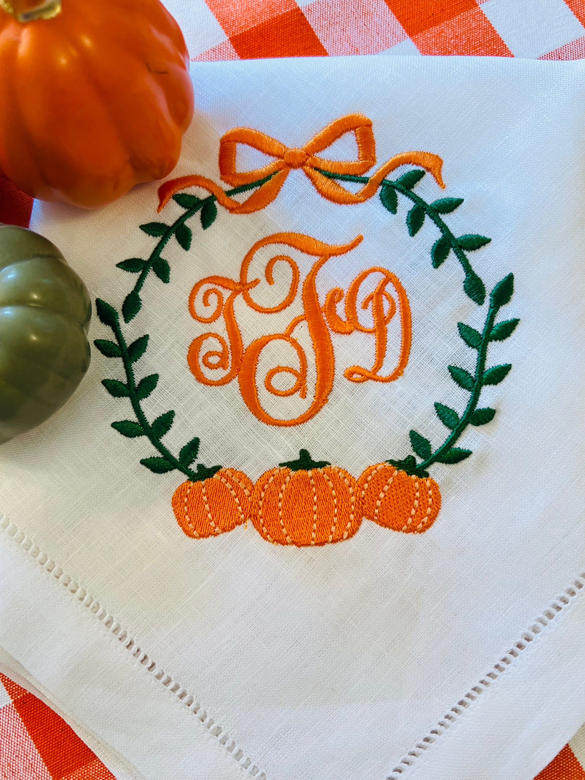 Beautiful pumpkin and vine crest with interlocking monogram in Orange on white hemstitched linen Dinner Napkin. Size is 20”x 20”.