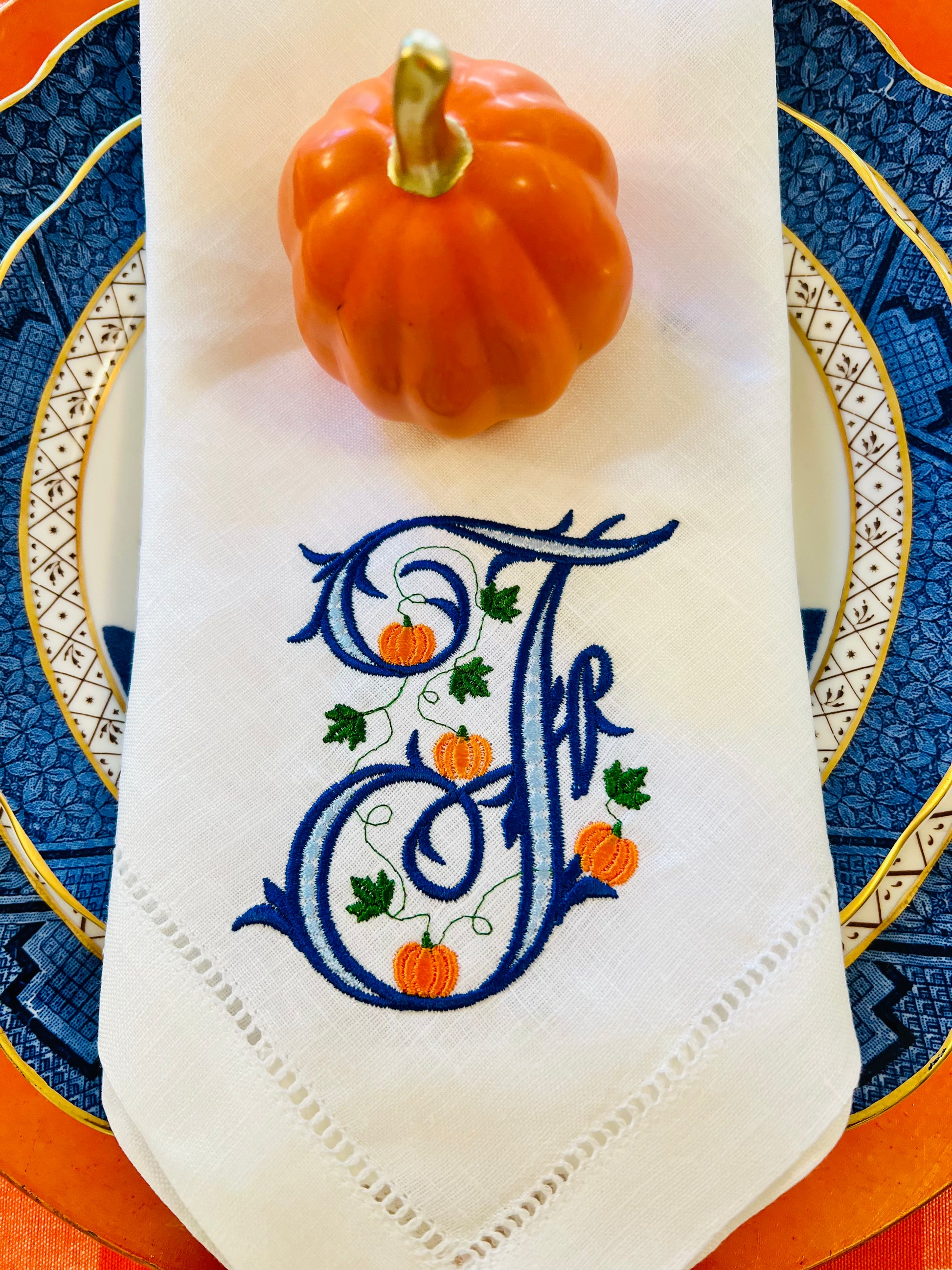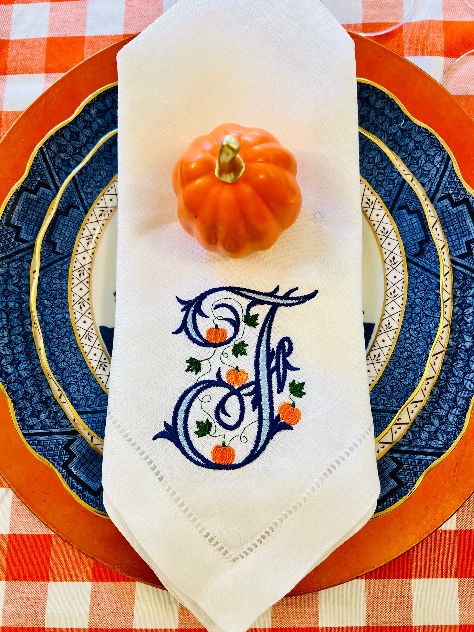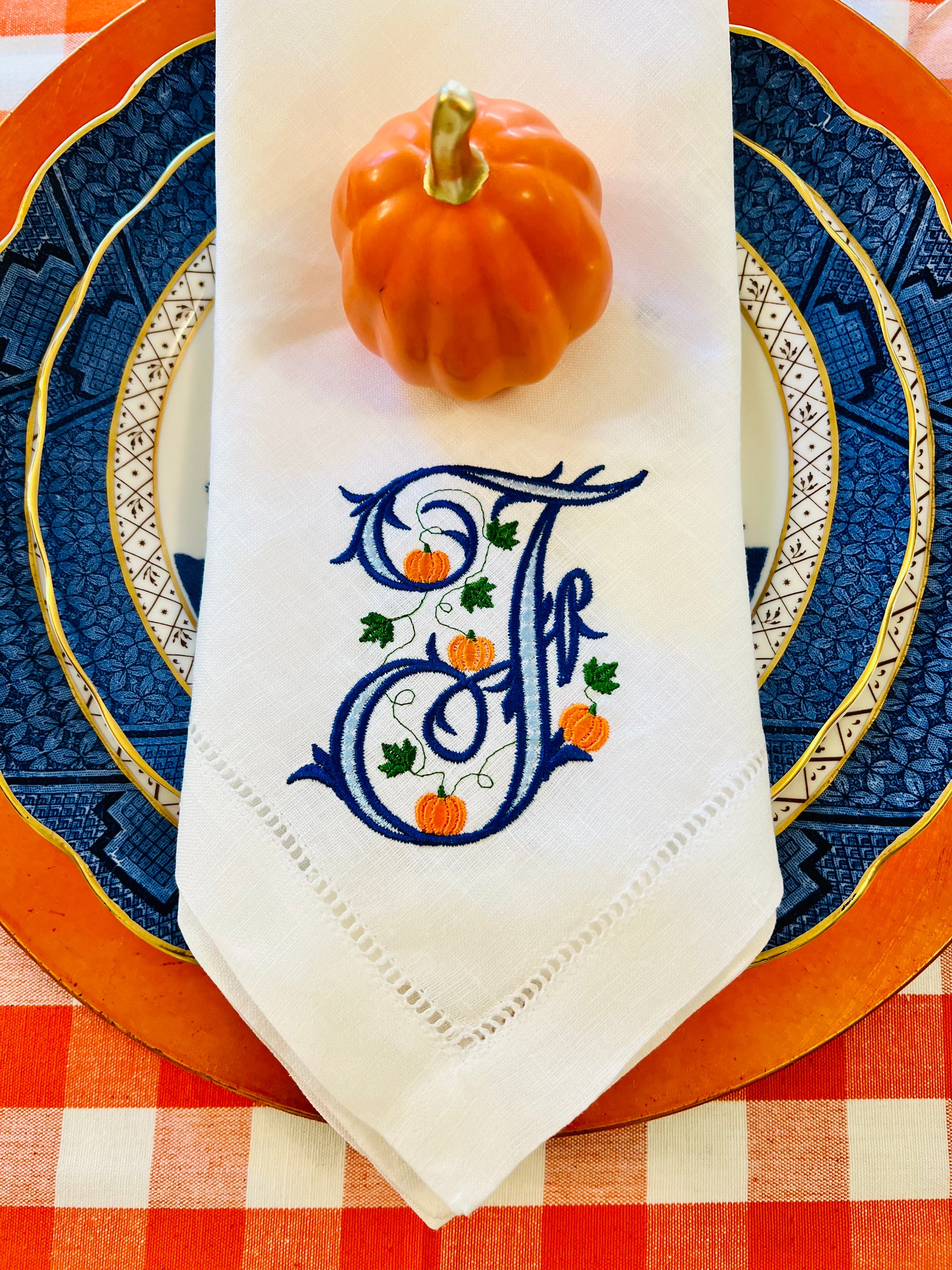 Adorable pumpkin vine monogram on a white linen hemstitched dinner napkin. Size 18” x 18”. Makes a perfect table setting for fall. Can be embroidered in any color. Can also be done on blue and white checked napkin.