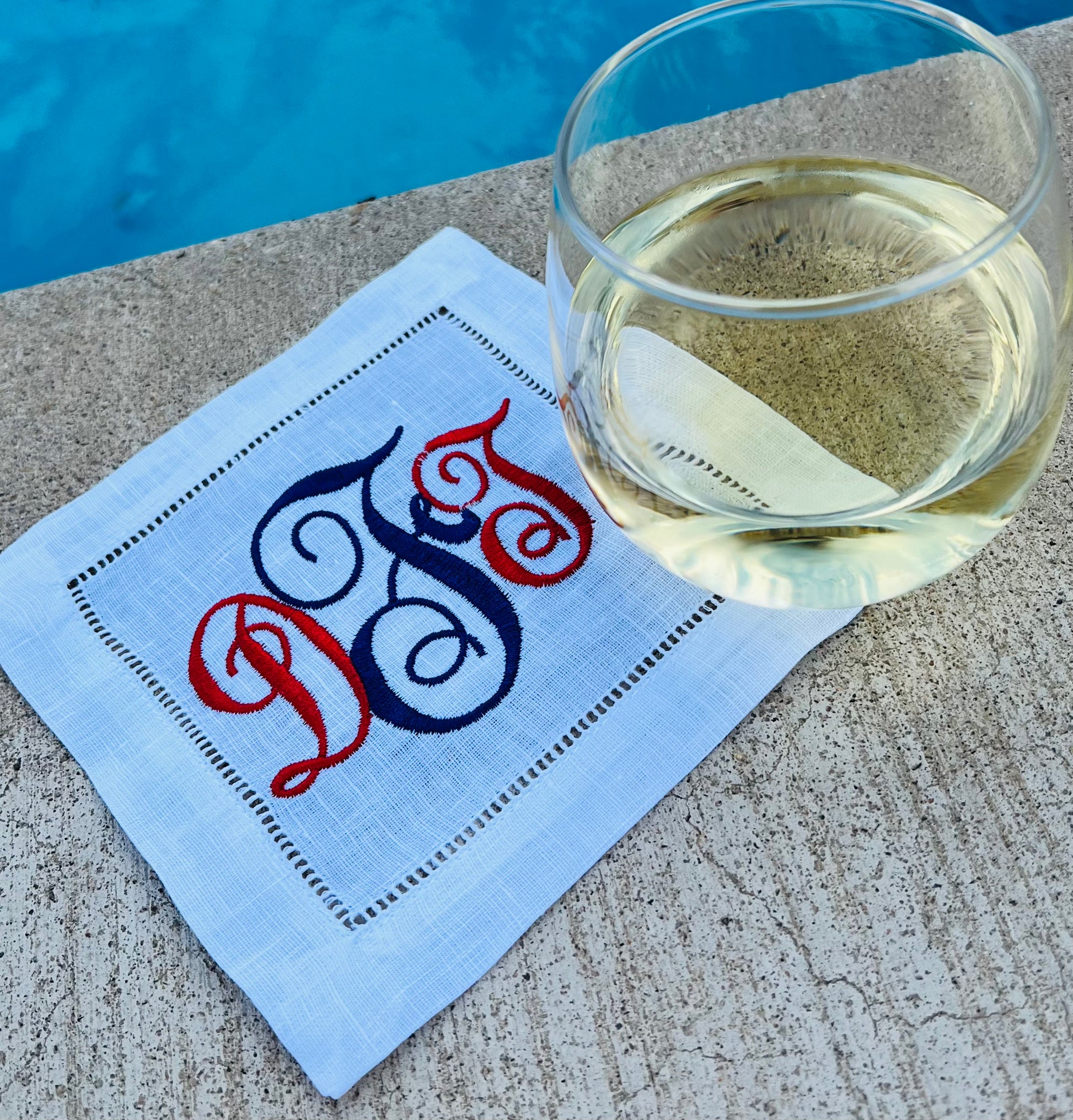 Red, White & Blue cocktail napkins embroidered with interlocking monogram on 6” white hemstitched linen white cocktail napkin. Set of 4.