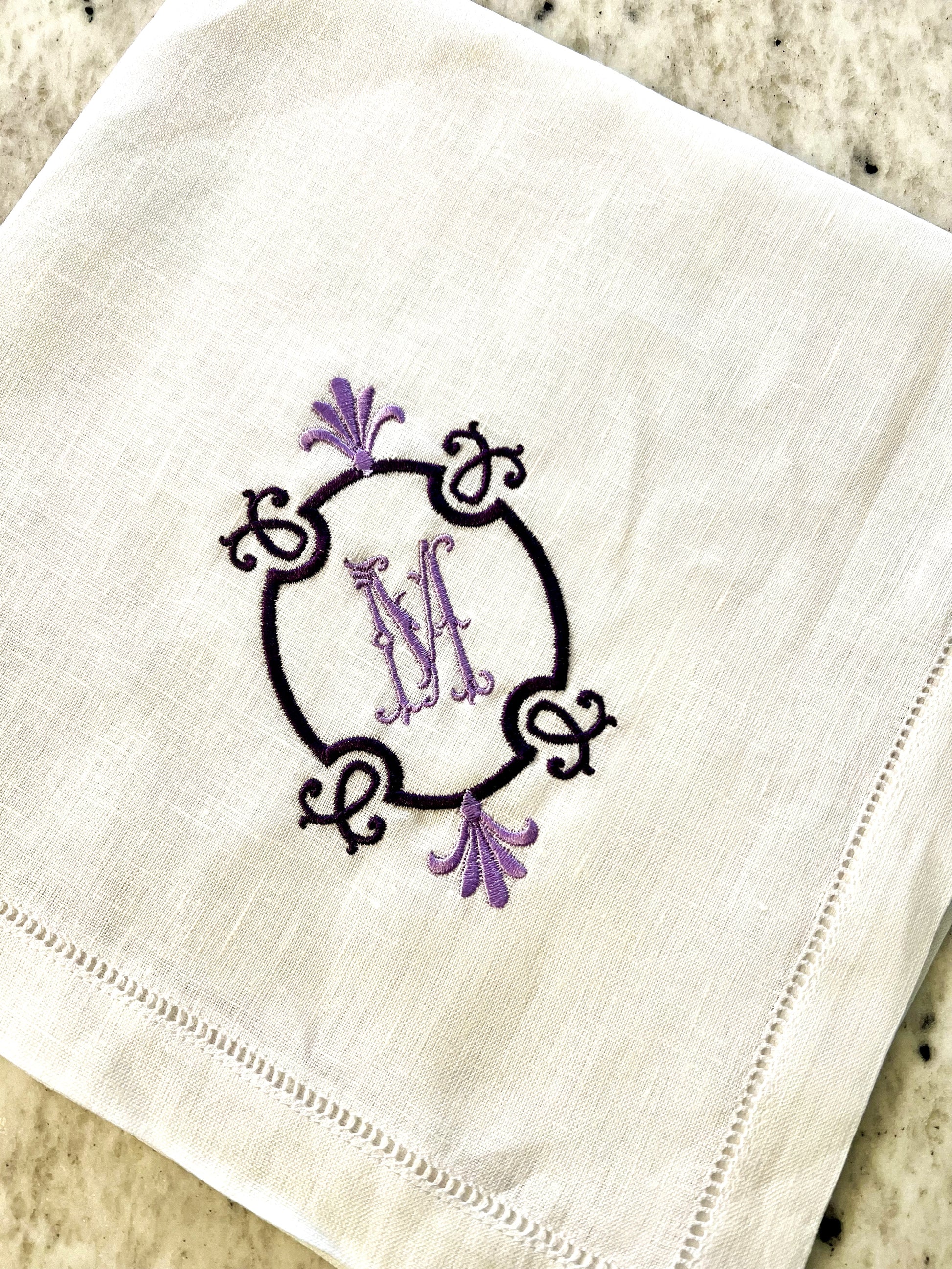 Beautiful Richmond Design with Monogram embroidered napkin on 100% linen hemstitch 18" x 18" white dinner napkin. It consists of two colors of your choice.