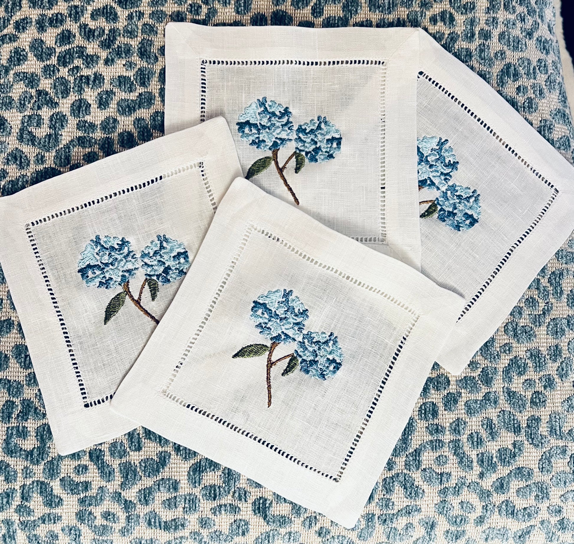 Beautiful set of 4 Blue Hydrangea cocktail napkins embroidered on white 4” linen square cocktail napkin.