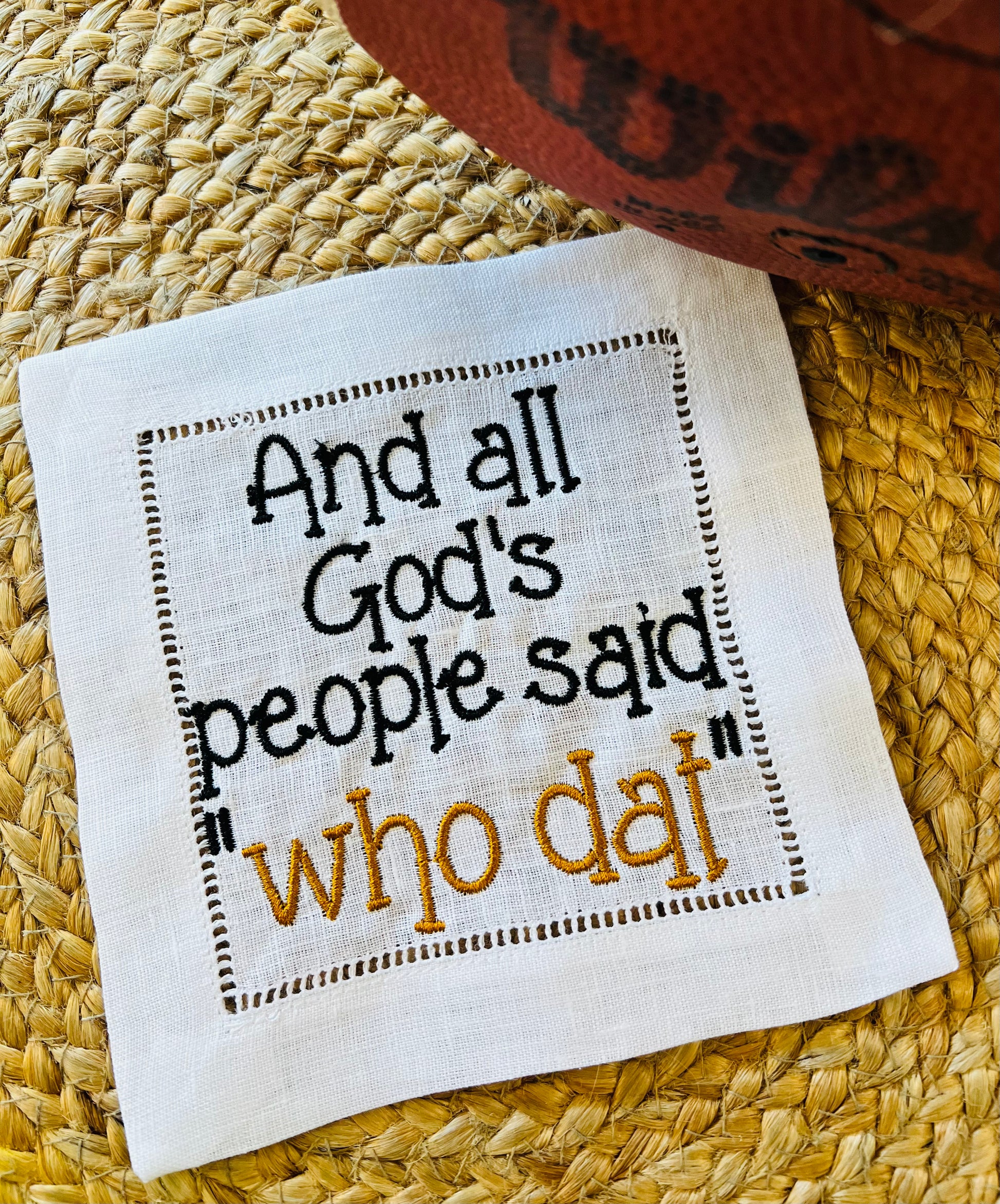 Go NOLA Saints! Set of 4 embroidered linen hemstitched 6” white cocktail napkins. Perfect for an afternoon of tailgating in The Big Easy!🎭